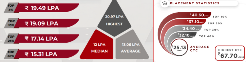 Recent batches have recorded an average CTC of ₹23–25 LPA and the highest packages above ₹58 LPA, with recruiters from top consulting, IT, finance, and FMCG firms.