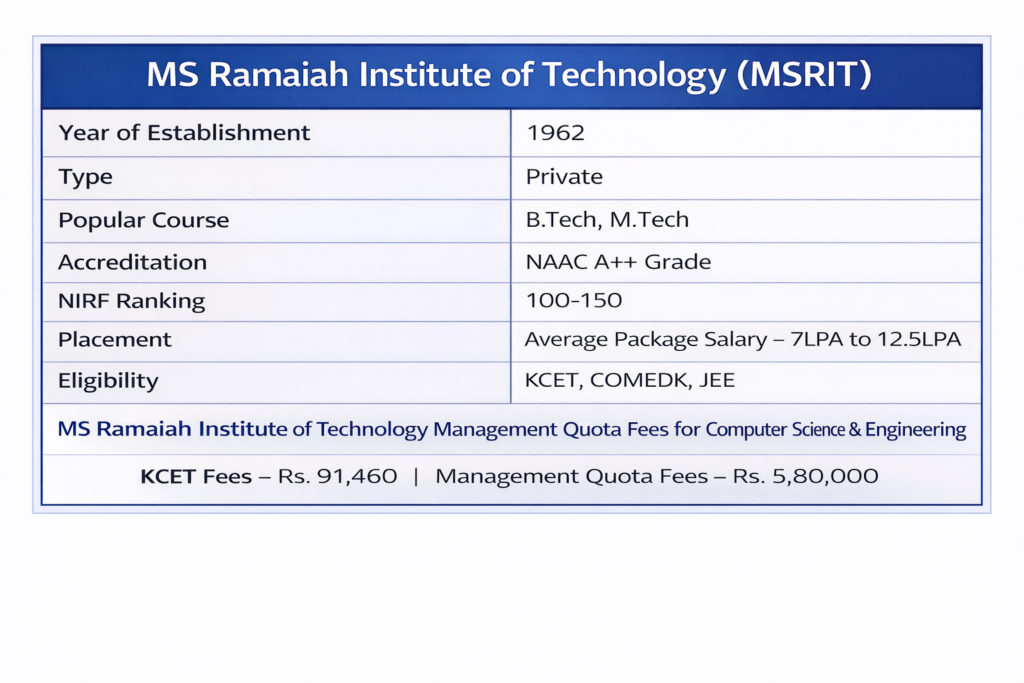 | MS Ramaiah Institute of Technology (MSRIT) | MSR Nagar, Bengaluru | ~1400 seats |